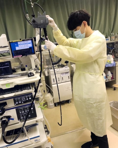 内視鏡関連業務では、臨床工学技士が検査前の内視鏡装置やスコープのセッティング、検査後のスコープ洗浄と消毒などの感染管理を行っています。また、内視鏡的粘膜切除術(EMR)や内視鏡的粘膜下層剥離術(ESD)、内視鏡的逆行性膵胆管造影(ERCP)といった専門的治療においても電気メスや処置具を操作し、医師の介助も行っています。