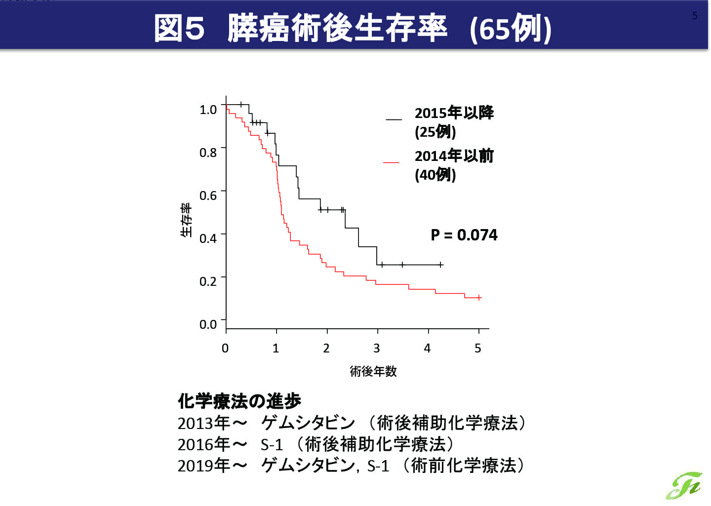 高難度手術の対象となるのは肝胆膵領域の悪性疾患が多く、胃癌や大腸癌に比較して予後は不良です。その中で十二指腸乳頭部癌、肝細胞癌、胆嚢癌は比較的良いですが、胆管癌、膵癌の予後は不良です(図3)。ただ、大腸癌肝転移(図4)や膵癌(図5)では、近年の抗がん剤の進歩に伴い、手術と抗がん剤治療を併用することで予後が改善しています。