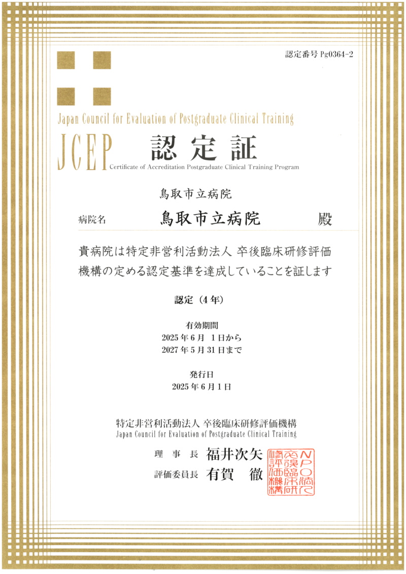 この度当院は、NPO法人卒後臨床研修評価機構(JCEP)による第三者評価を受審し、2025年6月1日付で4年間の認証を受けました。