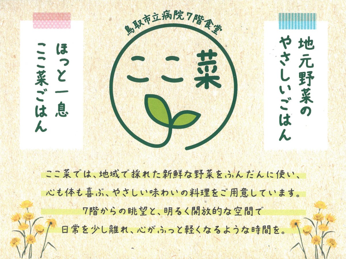 2025.09.26 患者さん・一般 7階レストラン「ここ菜」オープンについて 令和7年10月1日より、7階レストラン「ここ菜」がオープンいたします。 皆さま是非ご利用ください。 店名 レストラン ここ菜(ここな) 営業日および営業時間 平日 10:00~15:30(ラストオーダー 15:00) 休業日 土曜日、日曜日、祝日、年末年始